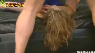 Шлюху умело трахают в рот до блювоты и заливают лицо спермой