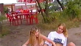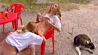 Молодые русские шалавы раздеваются в летнем кафе и лижут киски