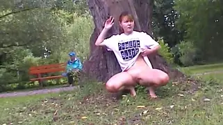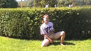 Порно видео Мастурбация, Сучка дрочит - Молодая рыжая москвичка вышла голой из кустов и уселась на лавку, на заднем плане мы видим столичный университет, сучка дрочит киску на фоне универа самотыком
