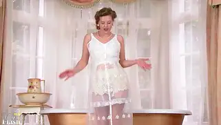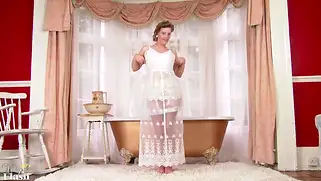 Порно видео Мастурбация, Зрелая - Зрелая невеста с большими сиськами снимает с себя подвенечное платье и остается в чулках, красотка берет в руки кувшин и обливает себя во время дрочки