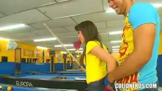 Пригласил поиграть в бильярд телку в желтой майке и стал ебать