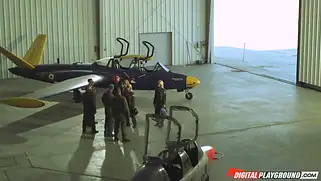 Порно видео Групповуха, - Девушки из летного училища после тренировочного полета сильно возбудились и стали сосать хуй инструктора в ангаре, летчик трахал блядей и заливал спермой