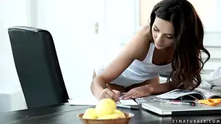 Стройная брюнетка устроилась работать в офис и ебется на столе