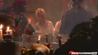 Белокурая королева пиратов делает глубокий минет и ебется в трюме