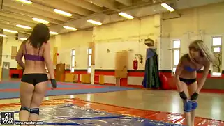 Порно видео Кунилингус, секс ххх - После страстной борьбы на татами в большом спортивном зале молодые девушки разделись догола и занялись сексом, лизали киски и наслаждались телами друг друга