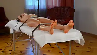 Парень привязал к кушетке русскую блондинку и дрочил киску