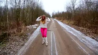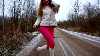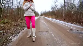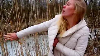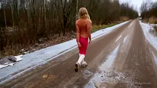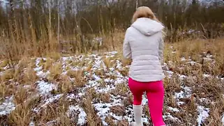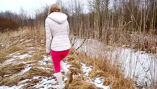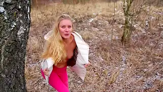 Порно видео На свежем воздухе, Русский трах - Белокурая русская сучка стягивает красные штанишки в машине и отправляется на прогулку по весеннему лесу обнаженной, не боясь холода и не стесняясь людей