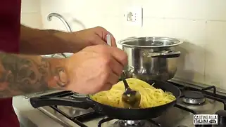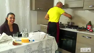 Порно видео Анал, Трах в анал - Лысый мужик накормил телочку спагетти и своим большим членом с презервативом в анус. Телочку раком трахают в попку большим членом и она стонет от анального секса.