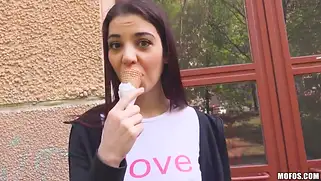 Телка с мороженым показала сиськи пикаперу и еблась на балконе