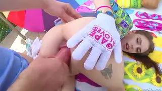 Порно видео Анал, Огромный член - Жопу девушки раком имеют огромным членом. Парень держит телку за ляжки в перчатках и погружает в анус свой огромный член, смазанный для лучшего проникновения.