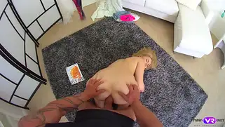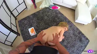 Парень лежит смирно на полу, а баба прыгает на члене попкой
