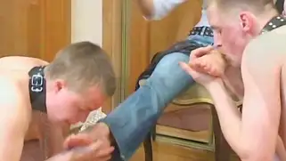 Retro Models - Худая русская домина повелевает послушными молодыми рабами в ошейнике, которые лижут ноги, телочка обожает трамплинг и дает лизать длинные ноги парням