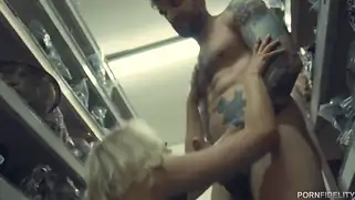 Секс на складе с кудрявой девушкой в киску и в ротик большим хуем