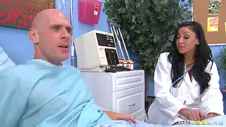 Johnny Sins - Темноволосая медсестра с большим силиконовым бюстом реанимировала сексом лысого пациента, девушка оживила самца вкусом пизды, а потом взяла в рот и еблась
