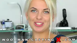 Русская блондинка кокетничает на кастинге и садится на шпагат