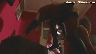 Порно видео Групповуха, Русский трах - Соблазнительные русские домины в кожаных длинных сапогах заставили волосатого парня лизать сочные писи и выполнять разнообразные приказы в небольшом помещении