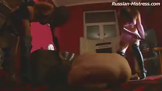 Русские домины в кожаных сапогах заставила парня лизать писи
