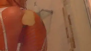 Шлюха в сексуальном белье и с большими титьками шалит в душе