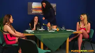 Три девушки собрались вместе трахаться в лесби угаре и кончать втроем голышом