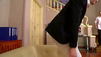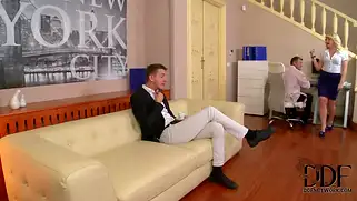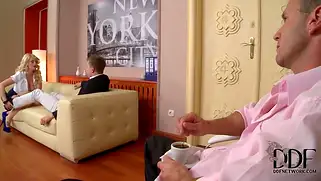 Порно видео Групповуха, Трах в очко - Блондина с большой жопой и натуральными сиськами раздевается с помощью парней и позирует в ажурном черном белье, телка трахается в очко с двумя парнями