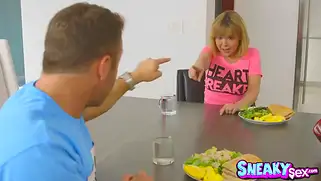 Порно видео В Сперме, Минет - Голая в скайпе телочка возбуждает парня и показывает ему, какая аппетитная попка его ждет, когда она придет в гости. Блонди пришла к любимому, а он болтает с какой-то теткой за столом. Это не остановило озабоченную милашку и она начала делать минет под столом, пока парень вел беседу с женщиной. Он едва не сорвался на стоны во время разговора, когда под столом пошлая сучка брала в рот хуй и облизывала головку. Когда дама ушла, начинается страстный секс на столе и на полу.