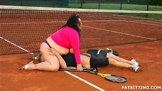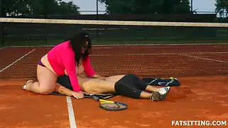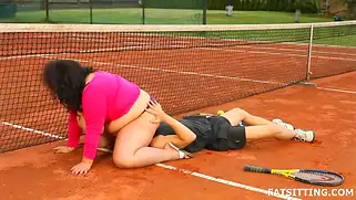 Сексуальная пышечка сидит на лице парня на теннисном корте