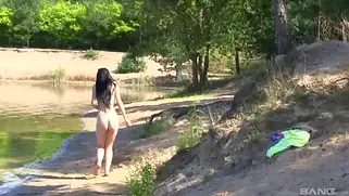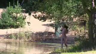 Нудистка Timea Bella на лесном озере в одиночестве дрочит киску