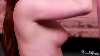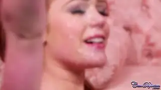 Рыжая девушка в белых чулах получает сперму на лицо и дрочит писю