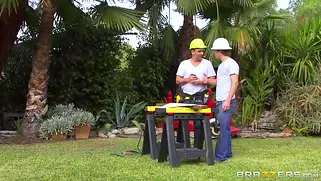 Brandi Love - Строители в касках оказались в гостях у зрелой белокурой хозяйки с большими сиськами Brandi Love. Дамочка пригласила мужчин в дом, где сразу же начала сосать члены парней, после минета последовала ебля