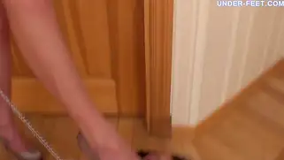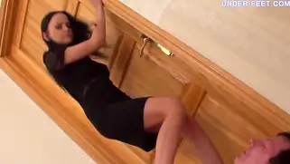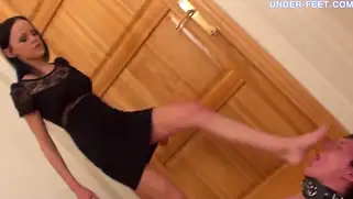 Порно видео HD, Платье - Стройная русская госпожа в коротком черном платье решила провести трамплинг для голого раба. Телочка ходила по телу самца в туфлях, а потом сняла обувь. Мужик принялся лизать ноги молодой шлюшки влажным языком