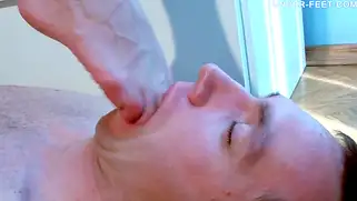 Русская молодая госпожа уселась на комод и дала парню лизать ноги