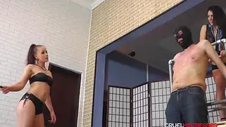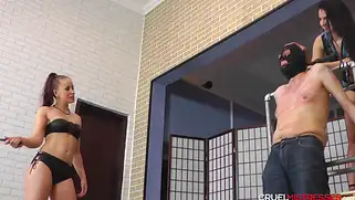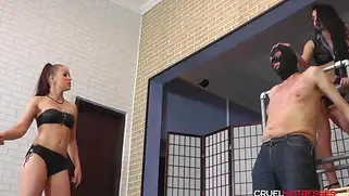 Госпожи в нижнем белье Mistress Anette и Mistress Kitty с порно рабом