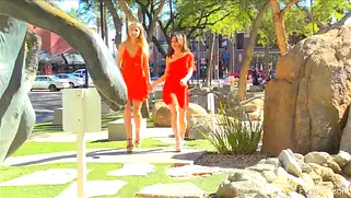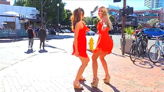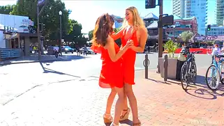 Порно видео HD, Оргазм девушки - Молодые сексуальные лесбиянки в красных платьях Melody и Harley гуляли по городу и дрочили киски публично. Девушки не стеснялись останавливаться в общественных местах, где помогали друг другу получить оргазмы