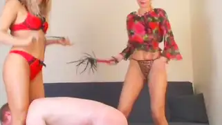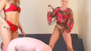 Порно видео с Kingstong, Jamaica Retro Models - Яркие русские госпожи в красном белье Sveta Brusser и Alisa решили развлечься с рыжим рабом. Девушки заставили голого мужика с конопатыми плечами служить ездовым средством и заставляли лизать длинные ноги
