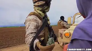 Порно видео Межрассовое, Член в рот - Парень в форме задержал ни за что гражданскую бабу и повел её трахаться. Он стягивает трусы с неё и начинает трахать в рот, а затем и в киску, нагибая девушку раком. Порно с солдатом начинается минетом, продолжается сексом и заканчивается камшотом в ротик этой восточной красотки в платке, а приятель все снимает на камеру.