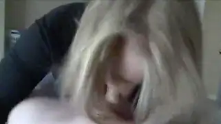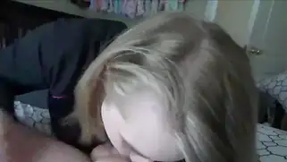 Home Porn - Пухлая молодая блондинка с большой грудью не снимает одежду когда сосет хуй парня. Сучка лижет мужику яйца и придерживает ствол члена рукой. Девушка глотает сперму когда мужчина кончает в раскрытый рот