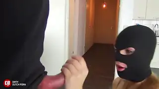 Порно видео HD, Член в рот - Сексуальная красотка надела на голову глухую черную маску с прорезями для глаз и рта. Сучка начинает сосать многочисленные мужские члены и раскрывает рот чтобы туда кончали. Шалава питается спермой парней