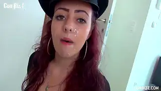 Сексуальная девушка в фуражке принимает в рот сперму парней