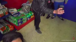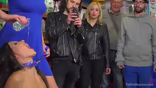 Госпожа ебет рабыню страпоном и мужики в магазине тоже ебут бабу