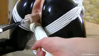 Порно видео БДСМ / BDSM, Парень кончает - Секс машина засовывает резиновый член в пизду бабе, когда она стоит раком с дырявыми штанами из латекса. Это порно в латексе ей устроил парень изобретатель, который зумутил устройство для ебли без участия парня. Длинный пенис на палке засовывается и вытаскивается из вагины бабы, которая стонет и кончает от секса раком.