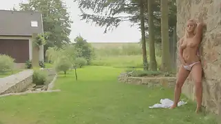 Порно видео HD, Девушка дрочит киску - Голая красавица блондинка с классными сиськами пошла на прогулку и немного притомилась. Девушка уселась на зеленую травку и стала дрочить киску пальцами, оперлась спиной на прохладную стену и обкончалась