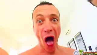 Рыжая баба отсасывает нескольким парням, получая камшоты на лицо