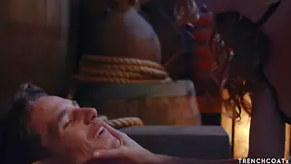 - Сексуальная и худенькая красотка будет стонать от классного секса в киску с парнем, которого она привела к себе в подвал и там связала ему руки. Сначала она наслаждается минетом и потом будет кайфовать от секса в свою тугую киску, от чего и кончает через некоторое время, а мужик кончает много густой спермы на пузо.