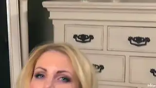 Блондинка с натуральными дойками дрочит на полу возле комода