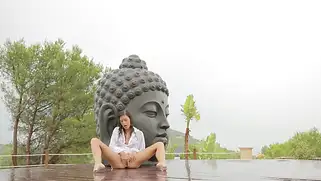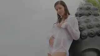 Русская телка в белой рубахе получает оргазм на фоне индийской статуи
