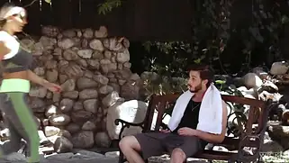 Опытная блондинка с сиськами трахается на свежем воздухе