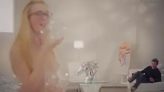 Очкастая блондинка играет с прозрачными шарами и ебется с опытным мужиком