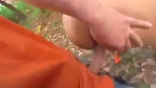Классная брюнетка хвалится сисечками и сосет хуй под деревом