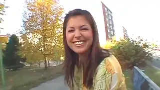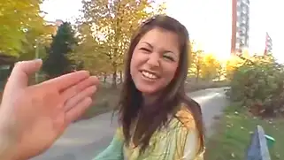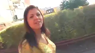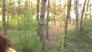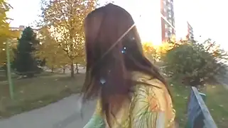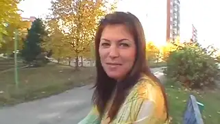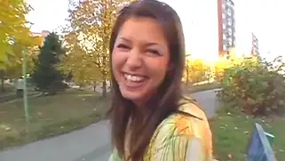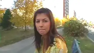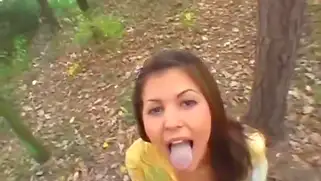 - Классная брюнетка хвалится сисечками и сосет хуй под деревом
