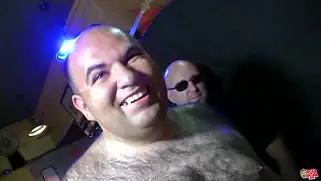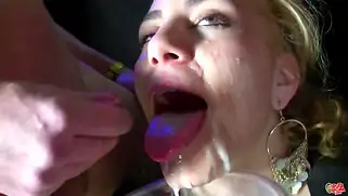 Жирный волосатый мужик с друзьями кончил в рот белокурой сучке